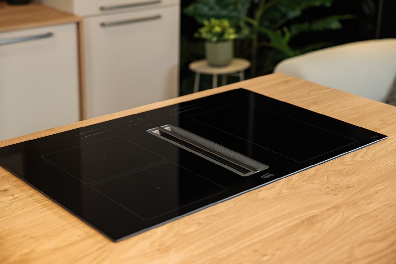 80cm široka indukcijska kuhalna plošča z odvodom pare navzdol in senzorskim upravljanjem.
